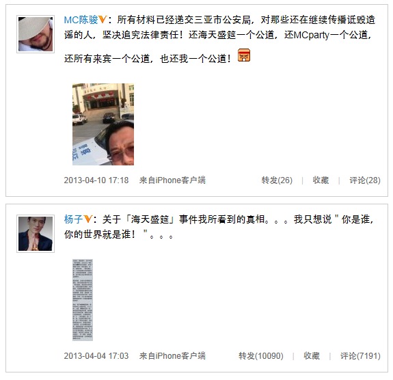 近幾日,三亞“海天盛筵”涉黃,淫亂派對(duì)的新聞可謂瘋傳網(wǎng)絡(luò)。早前有媒體報(bào)道,三亞市委宣傳部曾于4月4日向媒體發(fā)布新聞通稿,稱(chēng)已經(jīng)對(duì)網(wǎng)上有關(guān)“海天盛筵聚眾淫亂”傳聞?wù)归_(kāi)調(diào)查,對(duì)此事非常重視。三亞警方今日已正式通知“海天盛筵”主辦方三亞鴻洲國(guó)際游艇會(huì)、“MC白色派對(duì)”主辦方MC俱樂(lè)部等相關(guān)單位負(fù)責(zé)人于4月8日面談,配合調(diào)查工作。今天,“海天盛筵”主辦方之一,候鳥(niǎo)俱樂(lè)部負(fù)責(zé)人陳駿發(fā)微博稱(chēng),自己已經(jīng)將所有材料遞交三亞市公安局,將對(duì)那些還在繼續(xù)傳播詆毀造謠的人,堅(jiān)決追究法律責(zé)任。希望可以還海天盛筵一個(gè)公道。