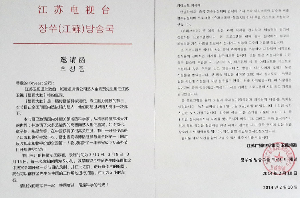 應(yīng)廣大粉絲的強(qiáng)烈呼聲,江蘇衛(wèi)視決定邀請(qǐng)金秀賢參加《最強(qiáng)大腦》國(guó)際PK賽的錄制。昨日中午,江蘇衛(wèi)視《最強(qiáng)大腦》在其官方微博發(fā)布了一條重磅消息:節(jié)目組已于2月10日向“都教授”金秀賢所屬的韓國(guó)經(jīng)紀(jì)公司Keyeast發(fā)出邀請(qǐng)函,誠(chéng)意邀請(qǐng)其擔(dān)任《最強(qiáng)大腦》的特約嘉賓。