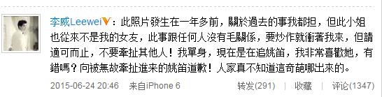 6月24日晚,李威發(fā)布微博回應“照片門”,表示“此照片發(fā)生在一年多前,關于過去的事我都擔,但此小姐也從來不是我的女友,此事跟任何人沒有毛關系,要炒作就沖著我來,但請適可而止,不要牽扯其他人!我單身,現在是在追姚笛,我非常喜歡她,有錯嗎?向被無故牽扯進來的姚笛道歉!人家真不知道這奇葩哪出來的。”