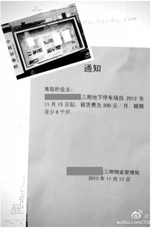 他稱將盡快對微博上的投訴進行回復(fù),以消除通知帶來的影響和誤會,同時將收集業(yè)主意見,慎重考慮停車位費用問題。