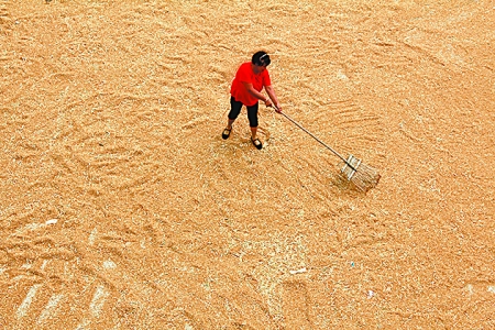 6月9日,內(nèi)黃縣城關(guān)鎮(zhèn)農(nóng)民在晾曬小麥。眼下,該縣83萬(wàn)多畝小麥喜獲豐收。劉肖坤 攝