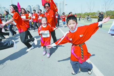 3月27日上午,鄭開國際馬拉松賽五公里小馬拉松比賽在鄭東新區(qū)舉行,情侶方隊、親子方隊等各具特色的參賽隊伍,給緊張的比賽帶來了輕松和快樂。
