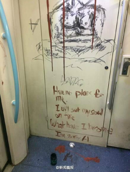 本整潔的地鐵車廂內(nèi)壁,被畫上了“半裸人體”的涂鴉,還用紅色顏料配上了酷似流血的圖案,看起來頗觸目驚心。
