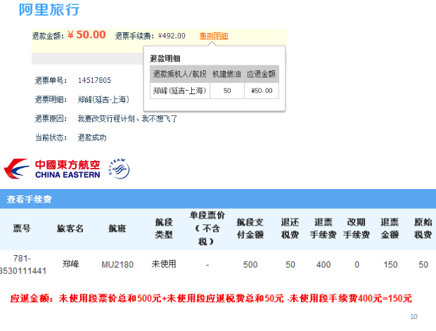 消保委質(zhì)疑:在購(gòu)票前消費(fèi)者并不知道退改簽規(guī)則,阿里拿著消費(fèi)者的信息在東航退票,東航把錢(qián)退給代理商,代理商從中拿了50塊退給了消費(fèi)者,阿里“吃掉”了部分退款手續(xù)費(fèi)?
