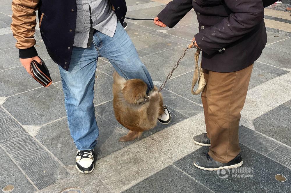 2016年12月11日,在合肥一公園門口,有幾只猴子在主人的指令下,緊緊抱住行人的腿部,幫主人討要1元“擁抱費(fèi)”,如對(duì)方不給則緊抱不放。馬方/視覺中國