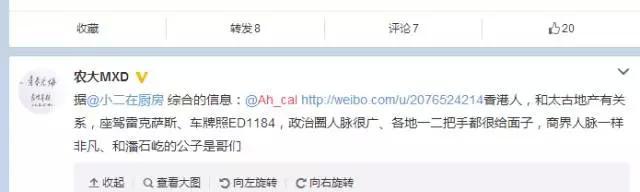 紅星新聞記者發(fā)現(xiàn),有網(wǎng)友爆料稱,@ah-cal是香港人,和太古地產(chǎn)有關(guān)系,座駕雷克薩斯,車牌照ED1184。和潘石屹的公子有交集。不過,座駕、車牌照、和潘石屹公子有交集的證據(jù)似乎都來自@ah-cal以前微博的截屏,真?zhèn)尾恢?/p>