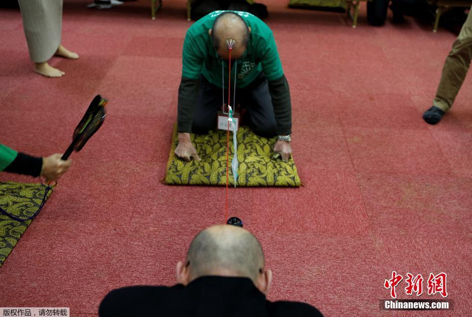 當?shù)貢r間2月22日,日本一謝頂男人俱樂部里,成員將吸盤吸附在頭頂進行拔河游戲。