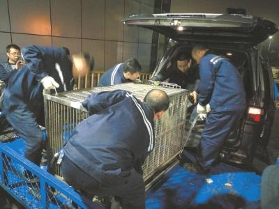 經(jīng)過近一個半小時的空中旅行,剛下飛機的“蜀蘭”還有一點驚慌。面對機場運輸工作人員,她有些焦慮地在籠子里轉來轉去,變換姿勢。