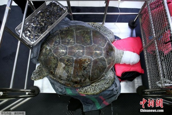 當(dāng)?shù)貢r(shí)間2017年3月6日,泰國(guó)曼谷,泰國(guó)朱拉隆功大學(xué)為海龜Omsin手術(shù)取出硬幣。據(jù)悉,一只痛苦的海龜誤吞了廢棄池塘中許愿硬幣,結(jié)果導(dǎo)致嚴(yán)重健康問題。