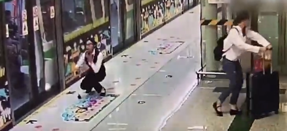 這一舉動(dòng)十足嚇了現(xiàn)場工作人員一跳,女子隨后不知什么原因,地鐵也不坐就離開了。