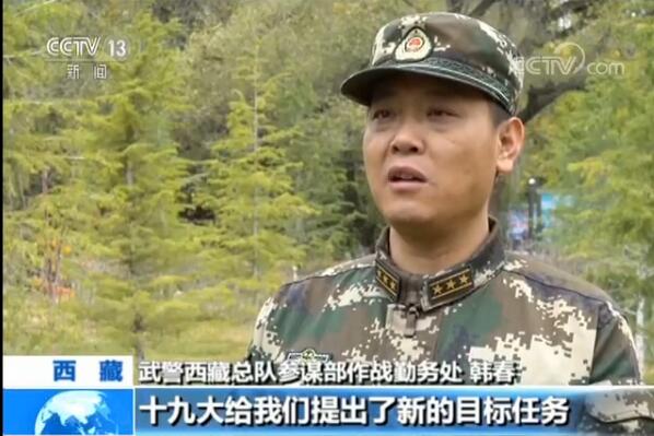 武警西藏總隊參謀部作戰(zhàn)勤務處 韓春:十九大給我們提出了新的目標任務,在新時代,作為守衛(wèi)祖國邊疆的武警官兵,按照習主席講的那樣,一定要有新氣象新作為,始終扎根高原、立足崗位,為實現(xiàn)強軍目標作出積極貢獻。