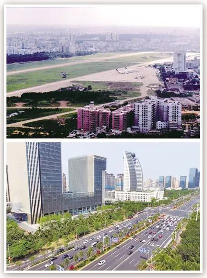 拼版照片為??谑袊?guó)興大道,曾經(jīng)是??诖笥⑸綑C(jī)場(chǎng)(上圖為1999年5月新華社記者姜恩宇攝,下圖為2018年4月14日新華社記者郭程攝)。 新華社發(fā)