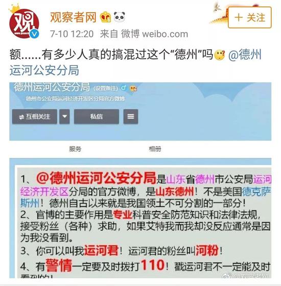 觀察者網(wǎng)在微博上艾特德州運河公安分局官方微博: