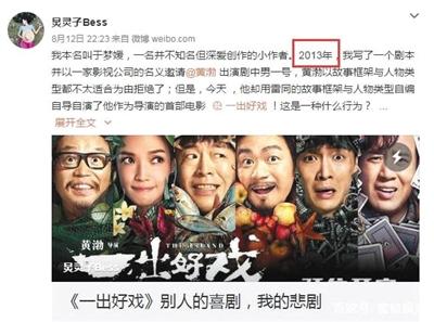 上映4天,黃渤導(dǎo)演的處女作《一出好戲》票房破6億。然而,8月12日晚,一位名叫于夢(mèng)媛的編劇在微博發(fā)文稱,黃渤的《一出好戲》涉嫌抄襲她2013年寫的劇本《男人危機(jī)》。她在文中說道:“2013年,我寫了一個(gè)劇本并以一家影視公司的名義邀請(qǐng)黃渤出演劇中男一號(hào),黃渤以故事框架與人物類型都不太適合為由拒絕了;但是,今天他卻用雷同的故事框架與人物類型自編自導(dǎo)自演了他作為導(dǎo)演的首部電影《一出好戲》!”新京報(bào)第一時(shí)間聯(lián)系了黃渤導(dǎo)演以及編劇于夢(mèng)媛,兩人均未做出回應(yīng);隨后又聯(lián)系了當(dāng)時(shí)參與《男人危機(jī)》籌備工作的工作人員張進(jìn)(化名),還原了當(dāng)時(shí)的一些事情經(jīng)過。