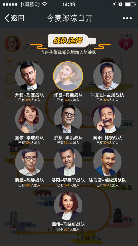 在河南十大名嘴戰(zhàn)隊(duì)中選擇一個(gè)你要支持的戰(zhàn)隊(duì)加入,即可為該戰(zhàn)隊(duì)捐贈(zèng)當(dāng)天的微信運(yùn)動(dòng)步數(shù),該戰(zhàn)隊(duì)獲得用戶捐贈(zèng)步數(shù)后可在規(guī)定的線路中前進(jìn),到達(dá)終點(diǎn)為獲勝。