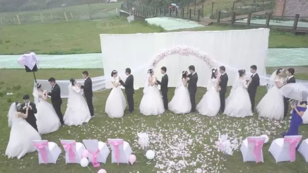 青山環(huán)抱的草坪中間,鮮花點(diǎn)綴,西服、婚紗、司儀……一樣不少,成對的新郎新娘溫情相擁,環(huán)繞的云霧和綿綿細(xì)雨,更為這場婚禮營造了浪漫的氣氛。據(jù)網(wǎng)上文章稱,婚禮現(xiàn)場的新郎、新娘們,是來自成都一高校工程造價(jià)管理專業(yè)大四一畢業(yè)班的15對情侶。