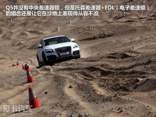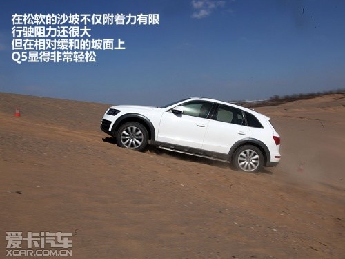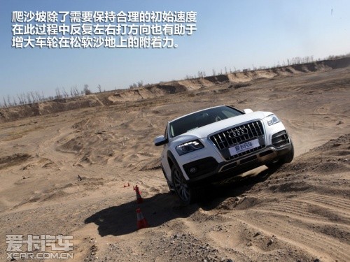 沙坡前半部分的坡度相對要緩一些,而奧迪Q5通過這里的過程自然也是毫不費力。那么在接下來更陡的后半部分當中,坡度的增大導致了車速急劇下降,此時松軟的沙子也就成為了車輛繼續(xù)攀爬的絆腳石,恰恰也就在此刻,檢驗quattro四驅系統(tǒng)真正能耐的時候隨之而來。