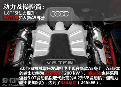 入門級(jí)的奧迪A5將采用1.8TFSI發(fā)動(dòng)機(jī),重新調(diào)教后,動(dòng)力輸出從158馬力提高到168馬力。2.0 TFSI發(fā)動(dòng)機(jī)的動(dòng)力輸出依舊為211馬力(155kW)。3.0TFSI機(jī)械增壓發(fā)動(dòng)機(jī)也出現(xiàn)在新款A(yù)5身上,A5版本的輸出功率為272馬力(200 kW)。奧迪S5也將采用這臺(tái)3.0T發(fā)動(dòng)機(jī)以取代此前的4.2升V8發(fā)動(dòng)機(jī),但動(dòng)力輸出更加出色,達(dá)到了333馬力(245kW)。變速箱方面,與以上幾款發(fā)動(dòng)機(jī)匹配的將有6速手動(dòng)、無級(jí)變速器、7速S tronic三種。