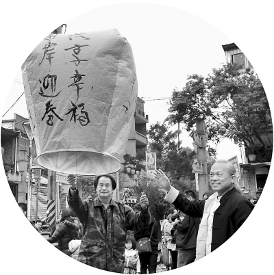 近日,臺(tái)灣毫芒雕刻家陳逢顯(右)與傳統(tǒng)天燈工藝大師林國(guó)和(左)一起放飛寫有“兩岸迎春· 共享幸福”的天燈。新北市平溪區(qū)放天燈久負(fù)盛名,已有百余年歷史。 王東明攝
