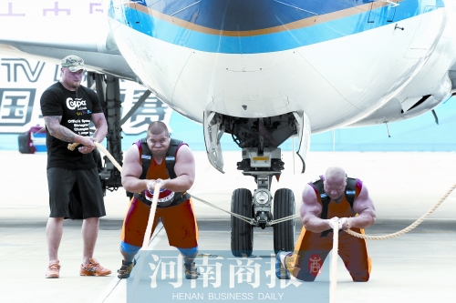 昨天下午3時(shí)許,鄭州新鄭國(guó)際機(jī)場(chǎng)。2013年世界大力士爭(zhēng)霸賽重頭戲——拉飛機(jī)比賽,在此上演。