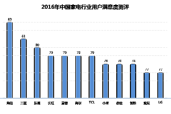 2017年1月3日,由中國質(zhì)量協(xié)會、全國用戶委員會組織開展的2016年中國家電行業(yè)用戶滿意度測評結(jié)果正式出爐:在電視類產(chǎn)品的用戶滿意度測評中,海信以83分高居第一,其次是三星、樂視TV、長虹、夏普。