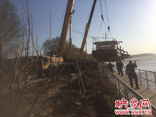 3月1日,執(zhí)法人員又來到汜水鎮(zhèn)趙村沙場岸邊,對一艘重達50噸的非法采砂船進行起吊離上岸。