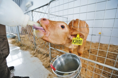 技術(shù)員呂博說,小牛犢們也是一日三餐,每次喂2公斤奶粉外,還加些犢牛顆粒飼料和干草。預計3個月大后,將逐步給它們斷奶。