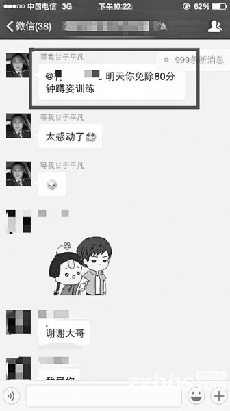 昨天,另一名學(xué)生趙鵬(化名)向記者出示一個微信群的幾張截圖,一張截圖中,一個穿軍裝男子發(fā)了一張露出自己大腿的圖片,然后說“你們能用美麗語言來形容一下我的腿嗎?”另一個截圖中,該男子說,“少了16個評論,16乘5是你們明天蹲姿時間,80分鐘,再見?!壁w鵬說,該男子就是總教官,他讓大家夸自己的腿,夸得好可以免受體罰,夸得不好就直接體罰。