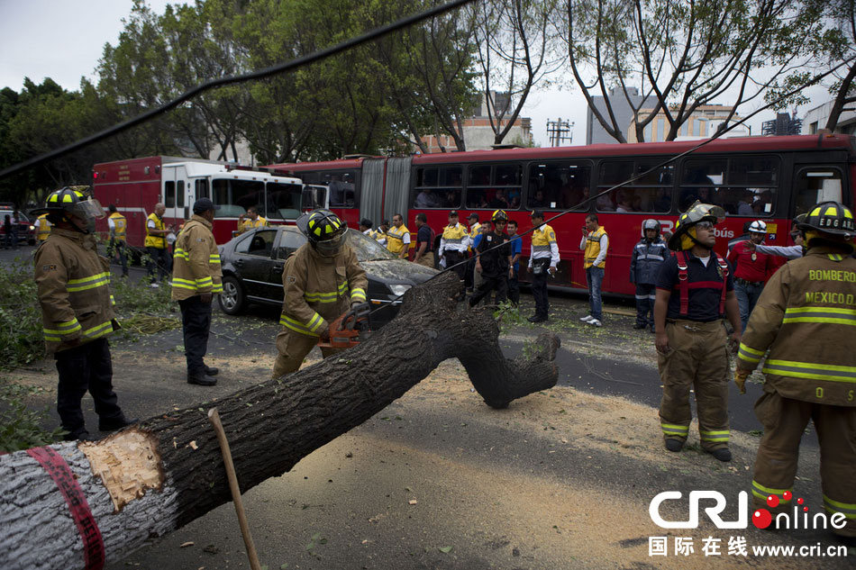 當(dāng)?shù)貢r(shí)間2014年5月8日,墨西哥墨西哥城,消防人員正在切割一棵倒下的樹(shù)?!D片來(lái)源:Rebecca Blackwell/東方IC