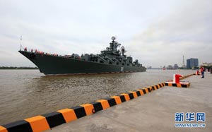 當(dāng)日,參加中俄“海上聯(lián)合—2014”軍事演習(xí)的俄方艦艇陸續(xù)駛抵上海某軍港。中俄兩國海軍互鳴禮炮,中方為來訪的俄艦舉行隆重歡迎儀式。俄羅斯太平洋艦隊旗艦“瓦良格”號導(dǎo)彈巡洋艦駛?cè)胲姼蹠r,參加歡迎儀式的軍樂隊奏響歡迎曲。隨后,“快速”號驅(qū)逐艦、“潘捷列耶夫海軍上將”號大型反潛艦、“伊利姆”號中型海洋油船、“涅維爾斯科伊海軍上將”號大型登陸艦,“卡拉爾”號海洋拖船陸續(xù)駛?cè)敫劭?。這次聯(lián)合軍事演習(xí),中俄海軍都派出了主戰(zhàn)艦艇參加。中方參演兵力包括導(dǎo)彈驅(qū)逐艦、導(dǎo)彈護(hù)衛(wèi)艦、綜合補(bǔ)給艦以及導(dǎo)彈艇等水面艦艇8艘、潛艇2艘、固定翼飛機(jī)9架。俄方參演兵力包括巡洋艦、反潛艦、驅(qū)逐艦、登陸艦、油船和海洋拖船等水面艦艇6艘。此外,為執(zhí)行海上聯(lián)合解救被劫持船只、護(hù)航等特殊任務(wù),雙方還派出艦載直升機(jī)、特戰(zhàn)分隊等兵力參加此次演習(xí)。新華社記者 查春明攝