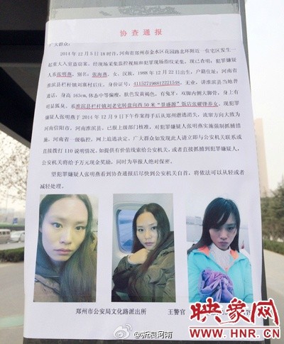 2014年12月5日,鄭州花園路北環(huán)附近一住宅區(qū)發(fā)生一起重大入室盜竊案,嫌疑人盜竊20余萬元財(cái)物后潛逃?,F(xiàn)查明:犯罪嫌疑人張明燕,女,26歲,有兔牙,身上有明顯狐臭。警方發(fā)布協(xié)查通報(bào),懸賞萬元緝拿。管你是誰,轉(zhuǎn)發(fā),幫警方追逃!