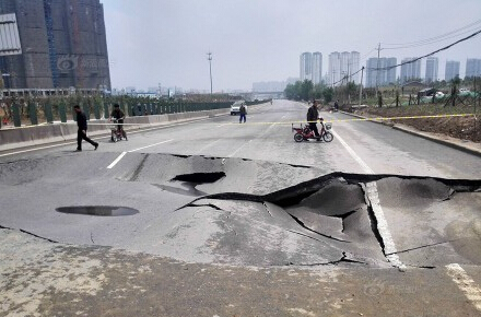 2日,開通不到半年的鄭登快速路在一場不大不小的雨后,塌陷出長16米、深1.1米的“天坑”。當(dāng)時一輛殯儀車經(jīng)過,沖出塌陷帶后撞上了隔離墩...施工人員檢查后初步判斷,塌陷不是修路質(zhì)量原因造成,可能有人損壞了路基。大雨:怪我咯?