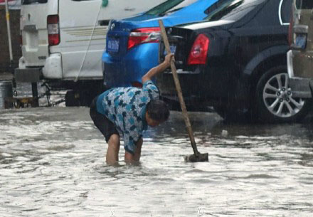 昨天下午,鄭州突降大雨。客技路中段,有200多米道路被雨水淹沒,積水最深處已經(jīng)到腿肚。一位大媽冒著暴雨在積水中清理下水口附近的垃圾,試圖讓水流得更快一些。