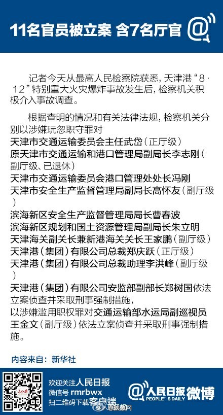 天津交通委主任武岱(正廳)、原天津交通運輸和港口管理局副局長李志剛(副廳、已退休)、天津安監(jiān)局副局長高懷友(副廳)、天津海關(guān)副關(guān)長王家鵬(副廳)、天津港集團總裁鄭慶躍(正廳)、總裁助理李洪峰(副廳)、交通部水運局副巡視員王金文(副廳)。