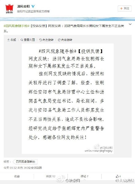 以往不少"性丑聞"官員都被查出貪腐問題。不妨順藤摸瓜,查一查張朝輝是否存在其他問題,給民眾一個(gè)交代。同時(shí),張朝輝今年初剛被任命為湯陰縣氣象局長(zhǎng),尚在1年試用期內(nèi)。既然出了如此影響惡劣的丑聞,組織上有必要對(duì)其任職資格和條件,重新進(jìn)行評(píng)估。