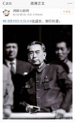 讓人難忘的細(xì)節(jié)不僅僅在閱兵場(chǎng)上。3日上午9時(shí)30分,習(xí)近平主席偕夫人彭麗媛正在天安門(mén)迎候各國(guó)嘉賓,閱兵尚未正式開(kāi)始,會(huì)場(chǎng)內(nèi)外興奮期待的氛圍漸濃。就在此時(shí),網(wǎng)友“周顧北的周”發(fā)布了一條微博“這盛世,如你所愿”,配圖是一張周恩來(lái)總理的老照片。短短的七字微博引發(fā)了網(wǎng)友的強(qiáng)烈共鳴,轉(zhuǎn)發(fā)已過(guò)百萬(wàn)。“開(kāi)國(guó)大典的時(shí)候飛機(jī)不夠,周總理說(shuō)飛兩遍,現(xiàn)在再也不需要飛兩遍了,要多少有多少。山河猶在,國(guó)泰民安。當(dāng)年送你的十里長(zhǎng)安街,如今已是十里繁榮?!?/p>