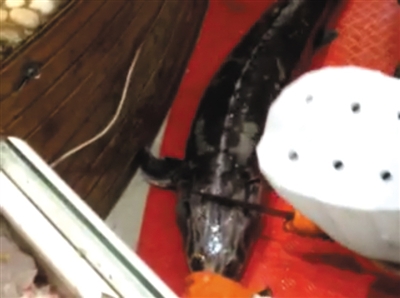 在海鮮市場海鮮廳另一攤位,擺放著一條約30斤的鱘鰉魚。攤位女老板告訴記者,死了的鱘鰉魚16元/斤,活的、重量在四五十斤的鱘鰉魚售價(jià)22元/斤。