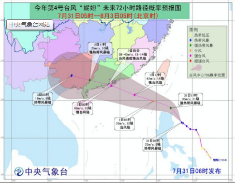 根據(jù)預(yù)報(bào),今年第4號(hào)臺(tái)風(fēng)“妮妲”,將于今日凌晨進(jìn)入南海東北部海面,之后繼續(xù)向西偏北方向移動(dòng),強(qiáng)度逐漸增強(qiáng),最強(qiáng)可達(dá)到強(qiáng)臺(tái)風(fēng)級(jí)(42-48米/秒,14-15級(jí)),并將于2日白天在廣東汕尾到陽(yáng)江一帶沿海登陸,登陸時(shí)為臺(tái)風(fēng)級(jí)或強(qiáng)臺(tái)風(fēng)級(jí)(38-45米/秒,13-14級(jí))。
