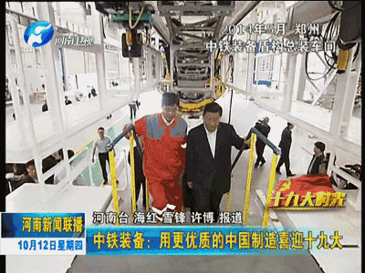 中國共產(chǎn)黨第十九次全國代表大會即將召開,今天起,河南新聞聯(lián)播推出《十九大時光》專欄,和您一起走進革命老區(qū)、田間地頭、工礦企業(yè)、街道社區(qū),傾聽基層干部群眾愛黨愛國的熱切心聲,感受人們建設(shè)出彩中原的火熱場景,聚焦十九大召開的歷史性時刻,共度這段特殊而又美好的時光。今天播出第一集《中鐵裝備:用更優(yōu)質(zhì)的中國制造喜迎十九大》。