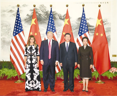 11月9日,國(guó)家主席習(xí)近平在北京人民大會(huì)堂東門外廣場(chǎng)舉行歡迎儀式,歡迎美利堅(jiān)合眾國(guó)總統(tǒng)唐納德·特朗普對(duì)中國(guó)進(jìn)行國(guó)事訪問。這是習(xí)近平和夫人彭麗媛在人民大會(huì)堂同特朗普夫婦合影。
