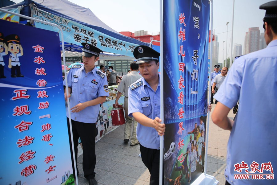 映象網(wǎng)訊 (記者 閆善良 文/圖)“你家人造(知道)嗎?”、“西班牙、英格蘭都回家了。哥們......咱也不在這添堵啦!”、“哥、姐,嫩(你們)別給這兒添堵啦?!?、“嘿,哥們!收攤兒回家看世界杯吧!”、“帥哥、美女,正規(guī)合法經(jīng)營(yíng)?!?、“金水城管告知您,醬紫(這樣子)不合適?!?月2日上午10時(shí)20分,鄭州市紫荊山地鐵站出入口,用網(wǎng)絡(luò)流行語(yǔ)寫成的十多塊宣傳板,呈弧形圍在一個(gè)占道經(jīng)營(yíng)商販的周圍,引來眾多市民圍觀。