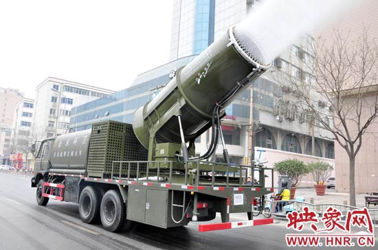 映象網(wǎng)訊(記者 王濤 通訊員 司佳 文/圖)“向著霧霾開(kāi)炮……向著揚(yáng)塵開(kāi)炮……”12月26日上午,鄭州市經(jīng)三路街頭出現(xiàn)了一輛形似炮筒的“大家伙”,吸引了來(lái)往車(chē)輛及行人的目光。