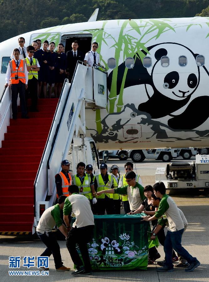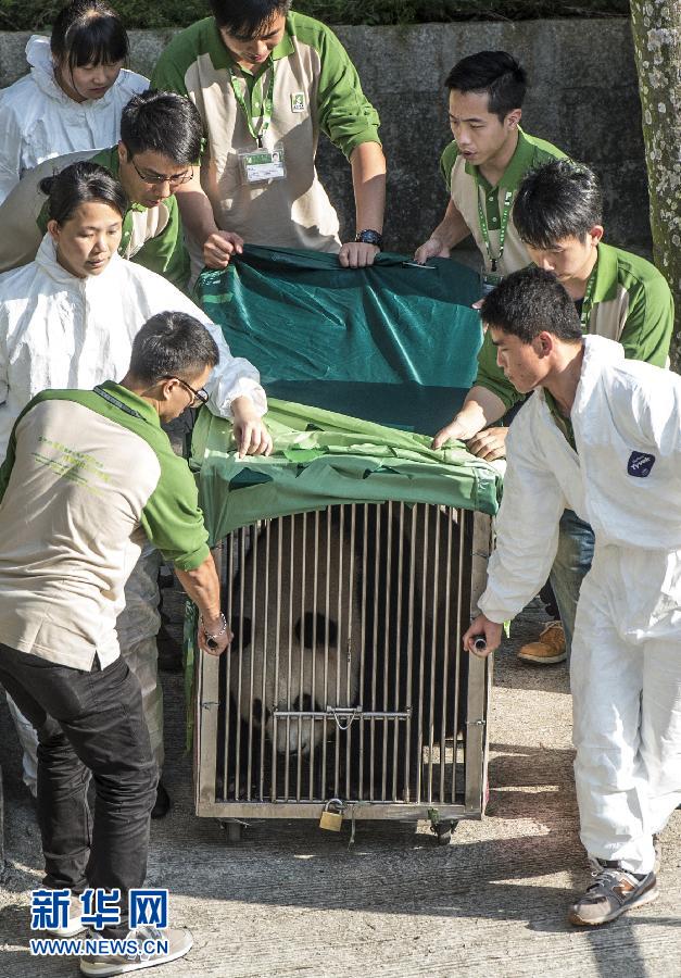 4月30日,工作人員將大熊貓運(yùn)送到澳門路環(huán)金像農(nóng)場的隔離設(shè)施地點(diǎn)。當(dāng)日16時許,中央政府贈送澳門的新一對大熊貓運(yùn)抵澳門,澳門特區(qū)政府行政法務(wù)司司長陳海帆等官員及部分少年兒童在機(jī)場迎接。大熊貓經(jīng)檢疫人員檢查后在運(yùn)輸籠中向前來接機(jī)的人們短暫亮相。目前它們身體狀況良好,隨后將前往金像農(nóng)場進(jìn)行30天隔離檢疫。新華社記者張金加攝