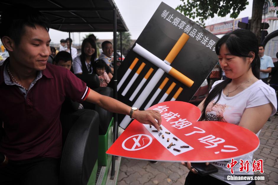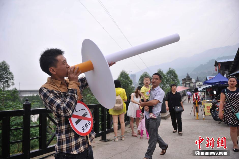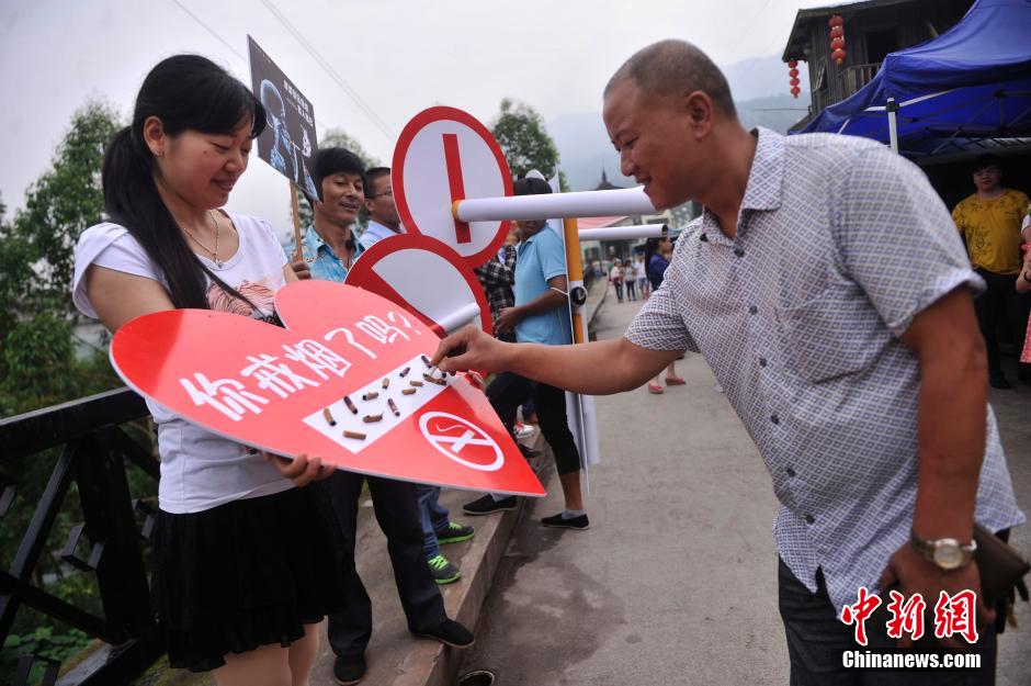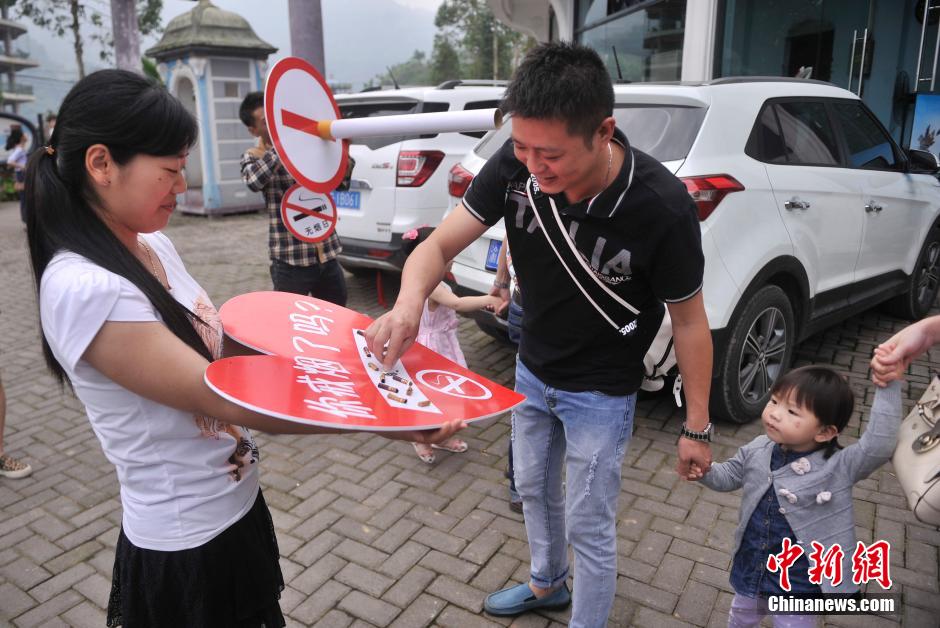 5月30日,重慶涪陵紅酒小鎮(zhèn)景區(qū)的工作人員拿著寫有“你戒煙了嗎”桃心形狀牌要求游客滅掉手中的香煙,迎世界無煙日。陳超 攝