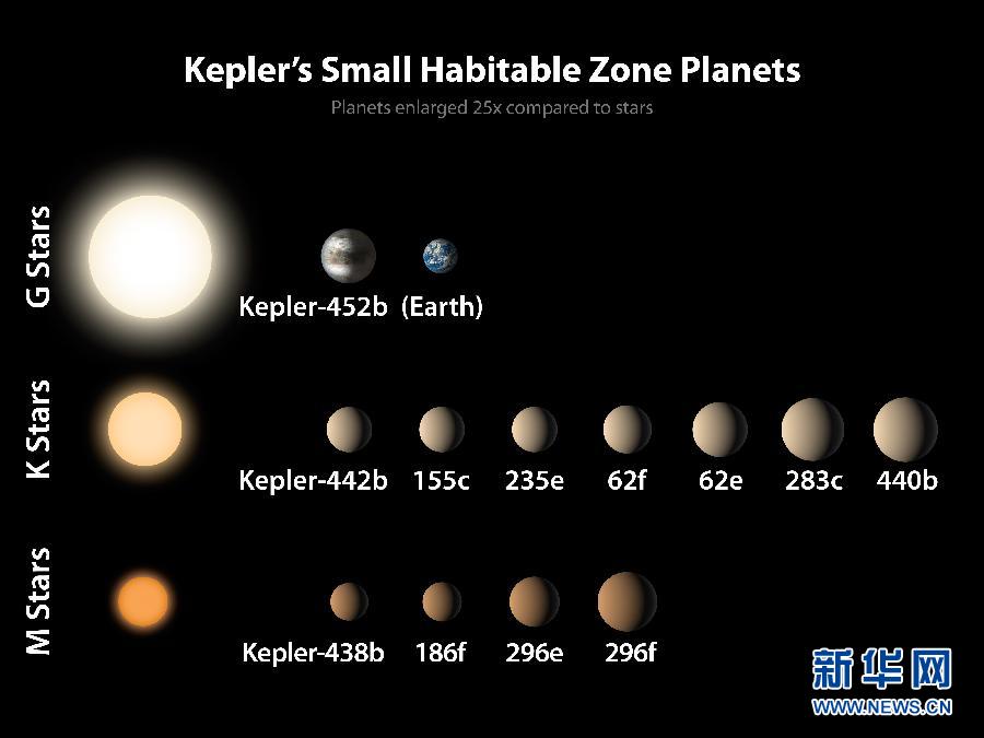 這張美國航天局7月23日公布的效果圖顯示的是新發(fā)現(xiàn)的12顆宜居帶行星,其中上右為地球,上左為太陽系外行星開普勒-452b。美國航天局23日在音頻新聞發(fā)布會上宣布,天文學(xué)家通過開普勒太空望遠(yuǎn)鏡確認(rèn)在宜居帶發(fā)現(xiàn)第一顆與地球大小相似的太陽系外行星開普勒-452b。新華社發(fā)