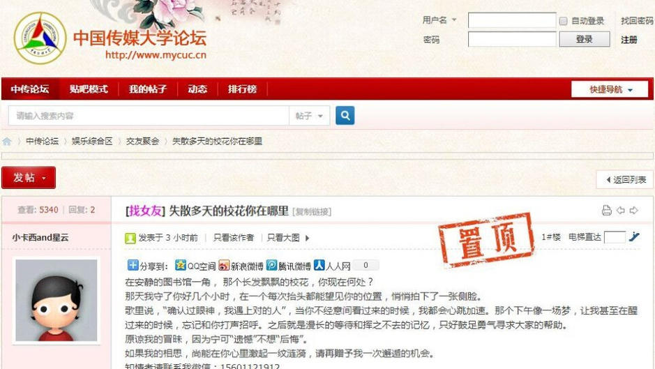 正值開學(xué)季,中國傳媒大學(xué)驚現(xiàn)癡情男,張貼了數(shù)百張海報(bào)只為表白?;?,據(jù)照片顯示,海報(bào)中有女孩側(cè)臉照片,還留下男生的聯(lián)絡(luò)方式,甚是精細(xì)。