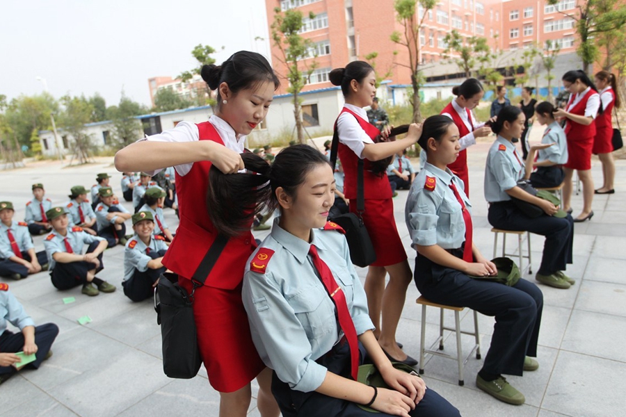 在大家普遍的印象里,學(xué)生軍訓(xùn)主要就是練隊(duì)列、踢正步等,最多還有軍體拳、步槍射擊。昨天上午,記者在鄭州航空工業(yè)管理學(xué)院軍訓(xùn)現(xiàn)場(chǎng)發(fā)現(xiàn),該院在站軍姿、踢正步等軍訓(xùn)項(xiàng)目上,引入卷尺、純凈水瓶等“裝備”,而且為“準(zhǔn)空姐”訓(xùn)練的課目中,還增加了如何盤(pán)發(fā)等項(xiàng)目。