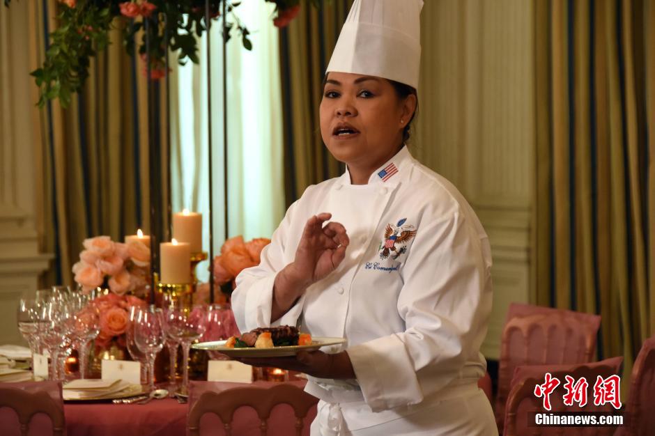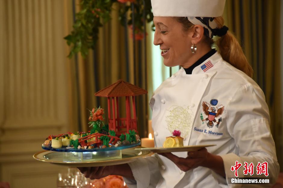 當(dāng)?shù)貢r(shí)間9月24日,美國白宮第一夫人辦公室發(fā)布了白宮為中國國家主席習(xí)近平和夫人彭麗媛舉行的國宴的菜單,并介紹了餐桌布置等情況。據(jù)這份菜單,紹興黃酒和南瓜月餅將亮相國宴。此外,白宮還邀請了華裔名廚參與此次國宴的準(zhǔn)備。中新社記者 刁海洋攝