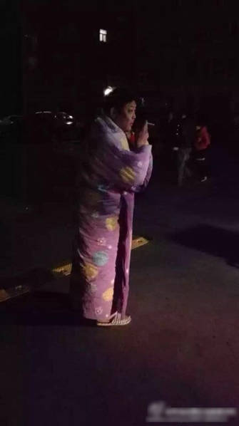 有網(wǎng)友反映,其時當?shù)貞敉鉁囟冗_零下十四度,許多市民出來避震時不得不罩著被子。圖為現(xiàn)場災民。