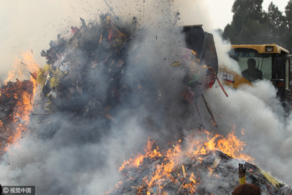 祈?,F(xiàn)場(chǎng),濃濃的煙霧讓人睜不開眼,兩輛大型鏟車不停地處理燃燒物,幾十個(gè)工作人員甚至用上了滅火器來(lái)處理殘留物。供圖:視覺中國(guó)